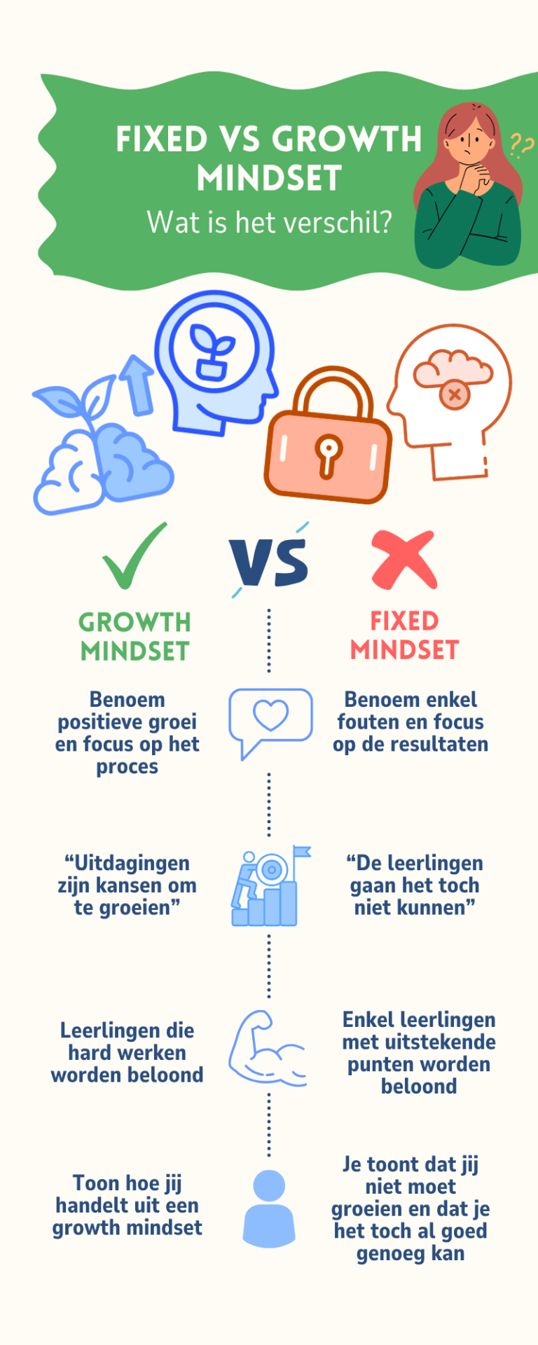 De mindset van de leerkracht beïnvloedt rechtstreeks de manier waarop leerlingen naar zichzelf kijken. In een klas waar de leerkracht een growth mindset uitdraagt: